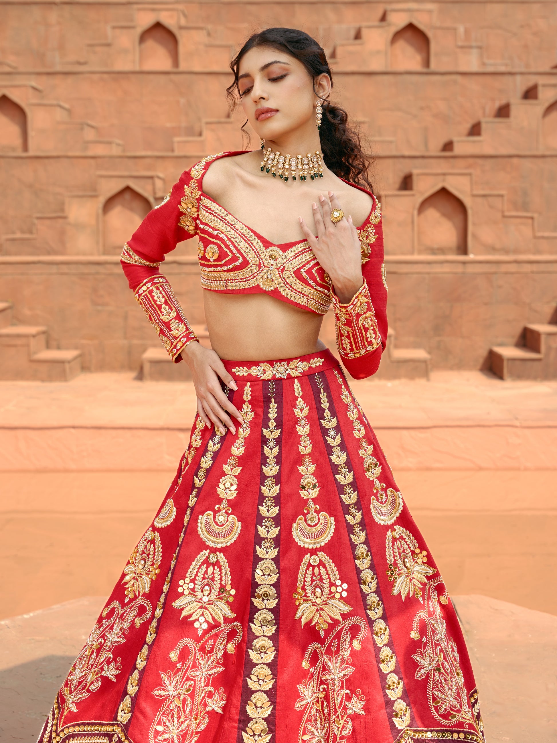 A bold red bridal lehenga handcrafted in raw silk, Agira fuses geometry and nature into one striking rhythm. Intricate panels of maroon and red feature fine zari, gold seed beads, pearls, glass stones, and clustered mirrors. Paisleys bloom through structured motifs, creating a contrast that feels powerful yet poetic. Each layer is delicately embroidered — balanced between raw strength and quiet detail. Perfect for brides who embody tradition with the modern edge.