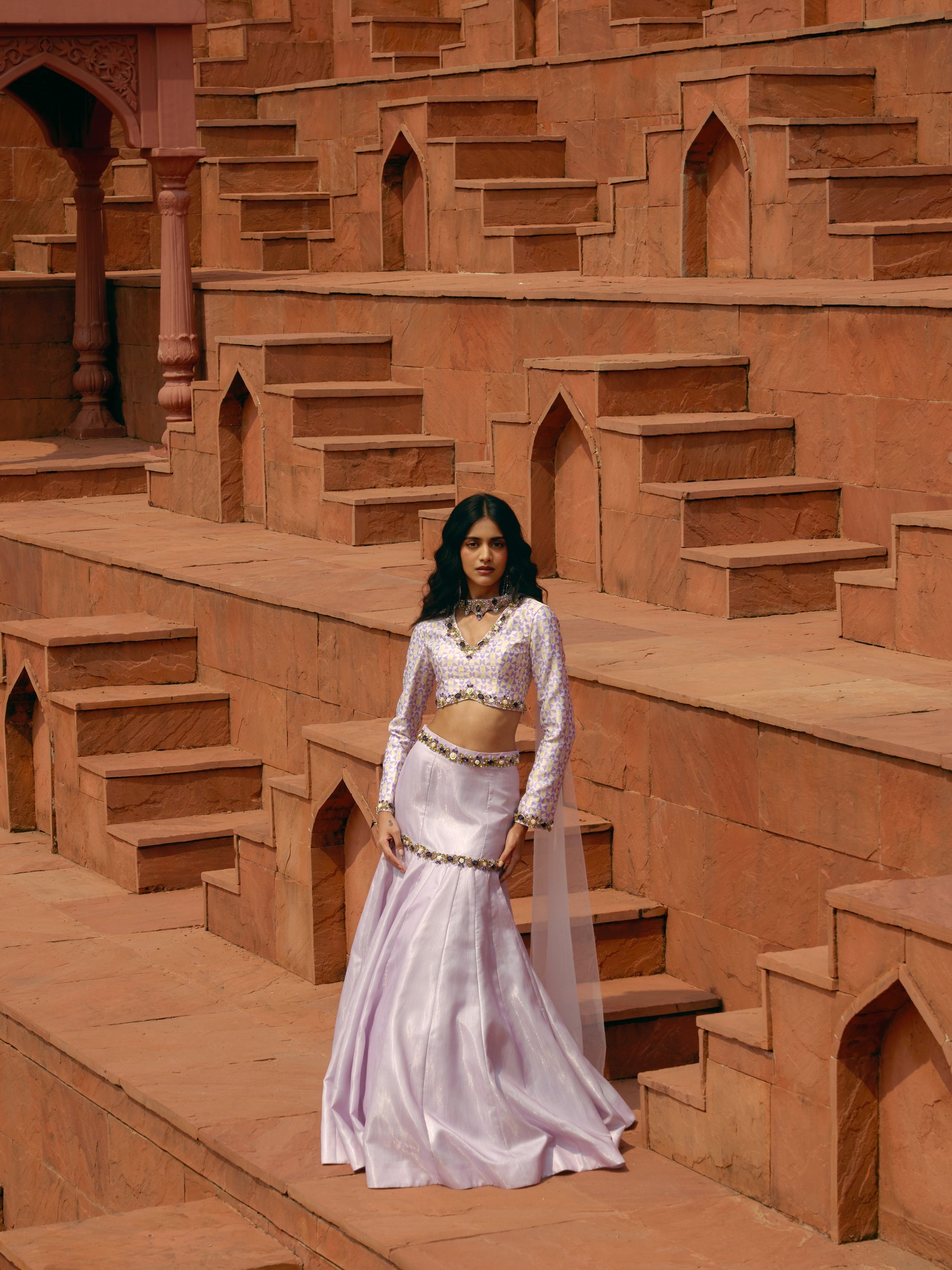 Experience our yummy, lilac, panelled lehenga. The perfect blend of elegance and pop. Its got a fun twirl to it embellished with beautiful shades of purple glass stones with a pop of lime and glass beads .All of them intricately combined to create a poppy rich yet modern look.