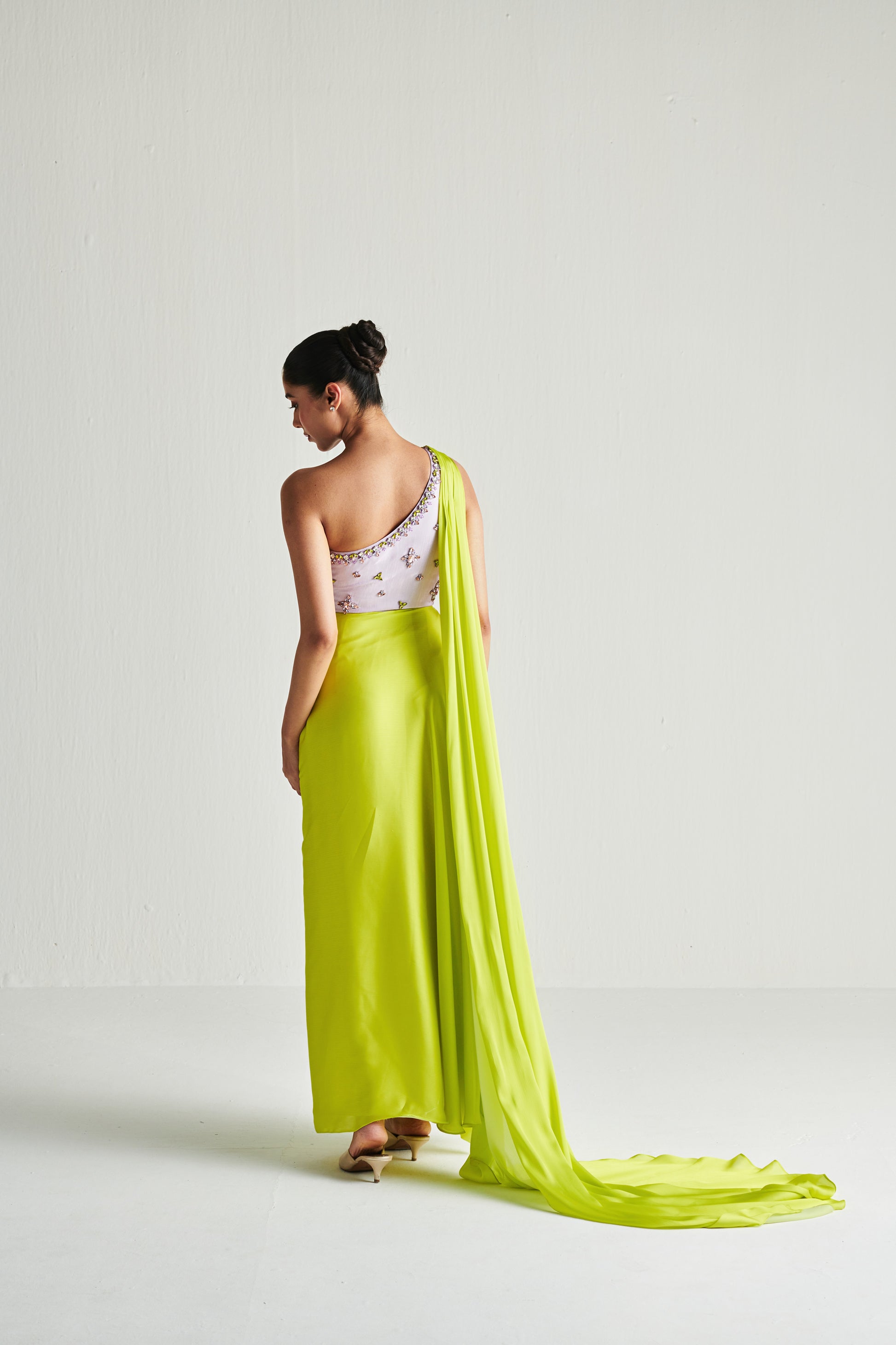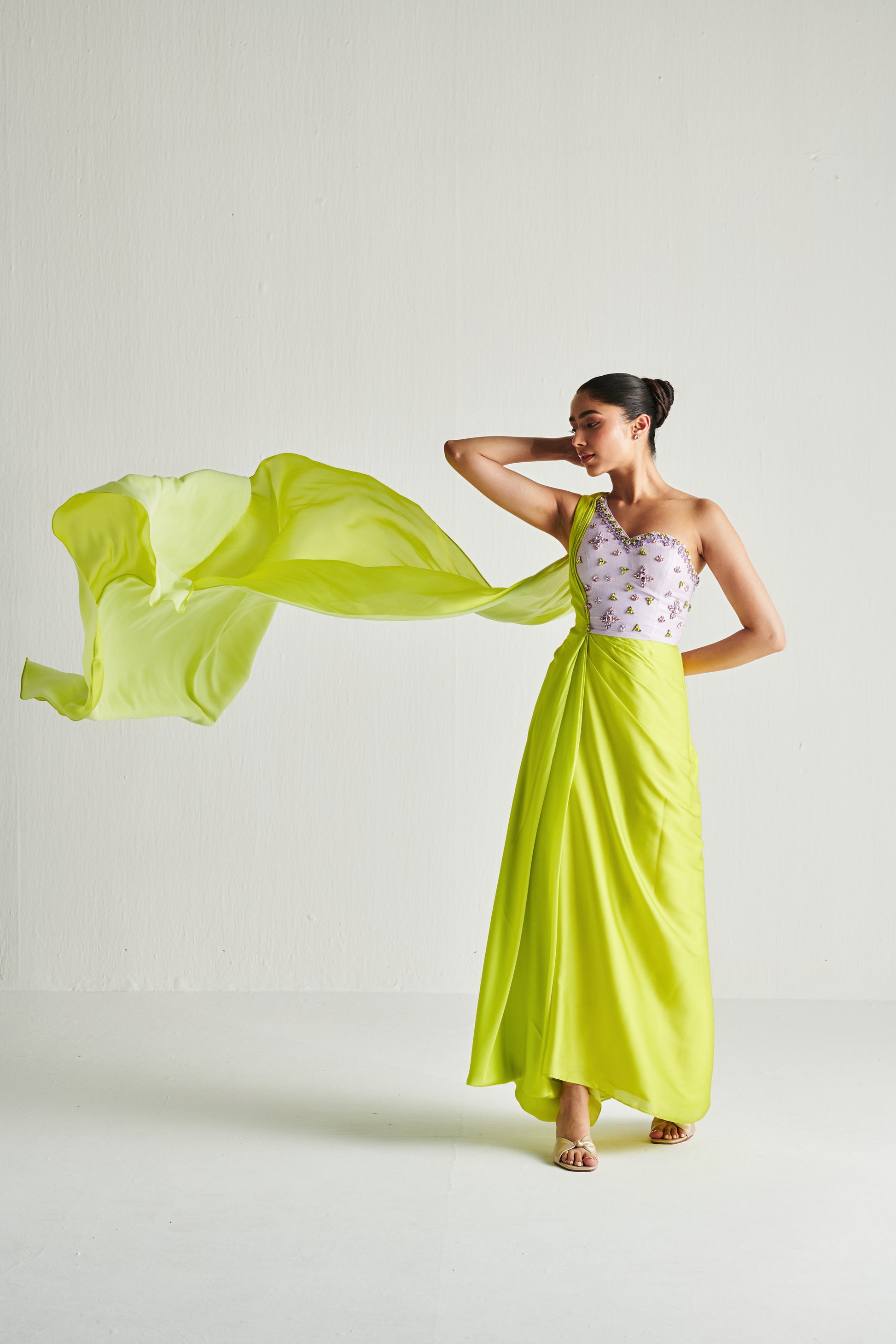 No other way to feel the punch of sour and sweet than the combination of lilac and lime. An eye-catching combination on its own embellished softly with chunky glass stones adorned with pretty purple seed beads and sequins. Draped for the modern times promises elegance and luxe.