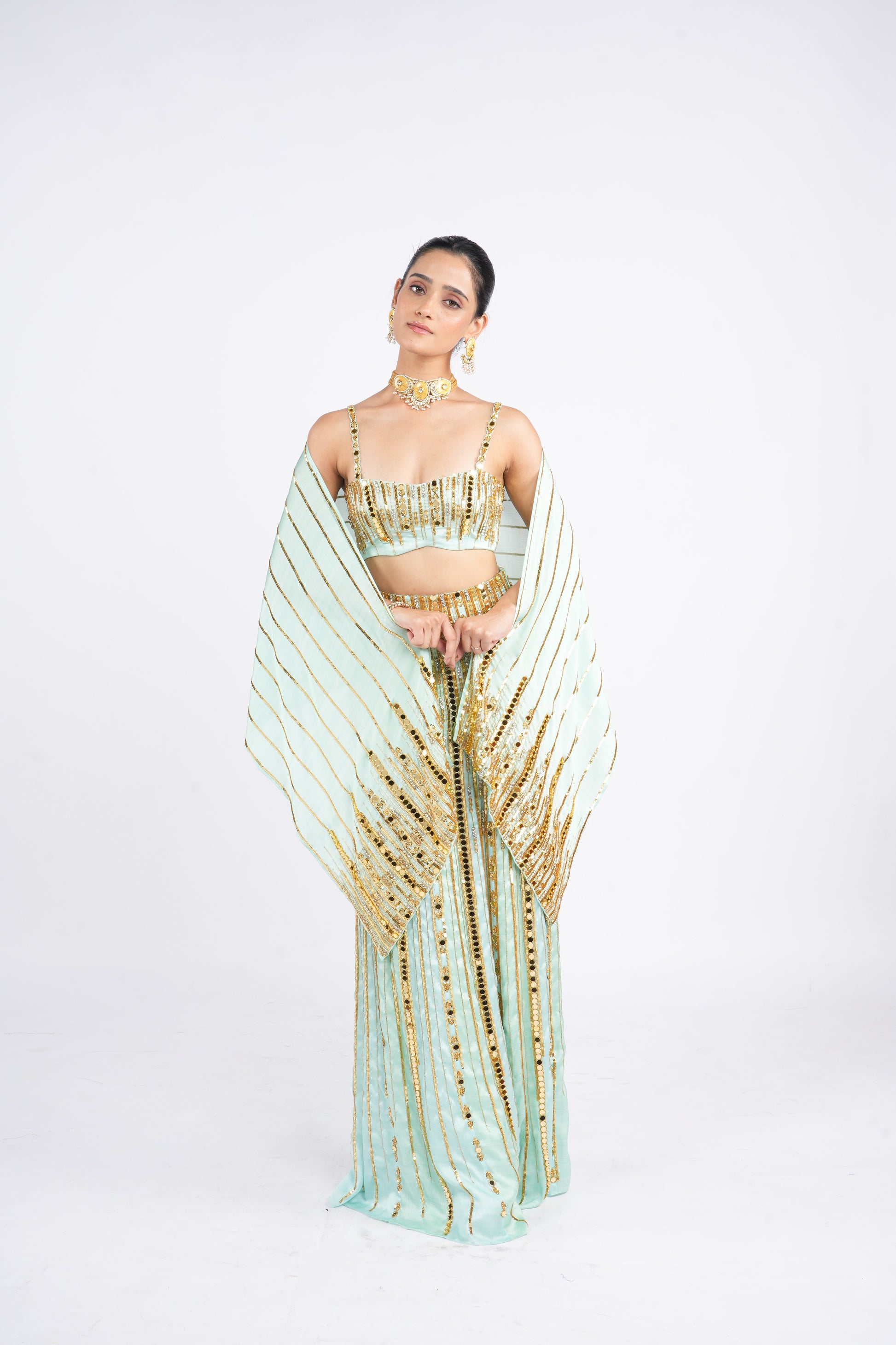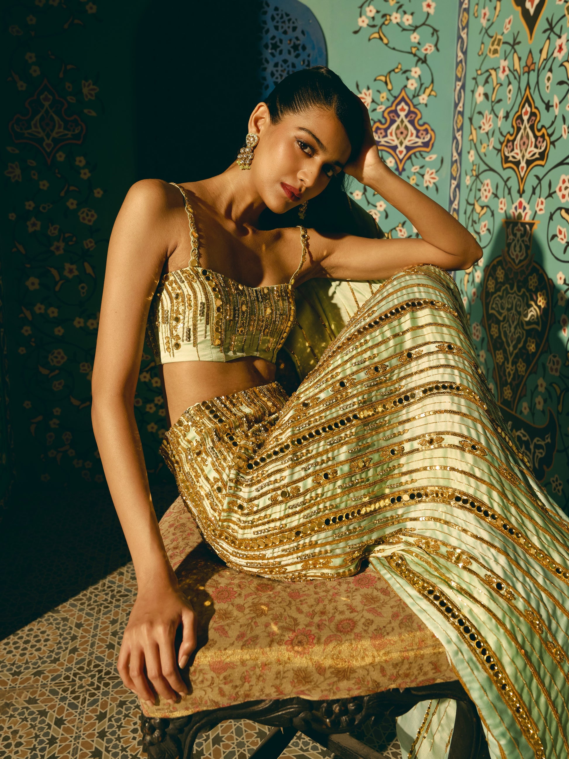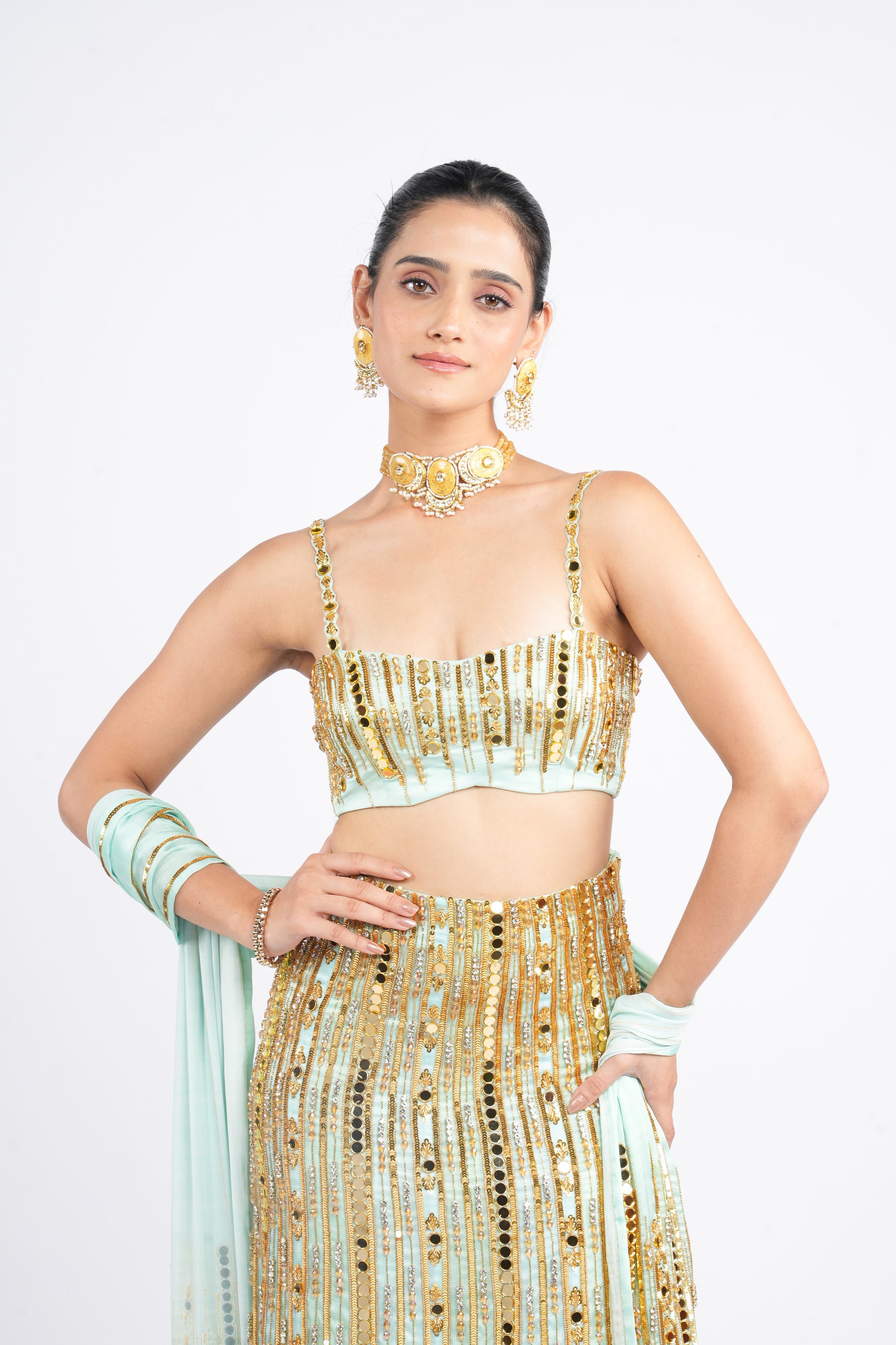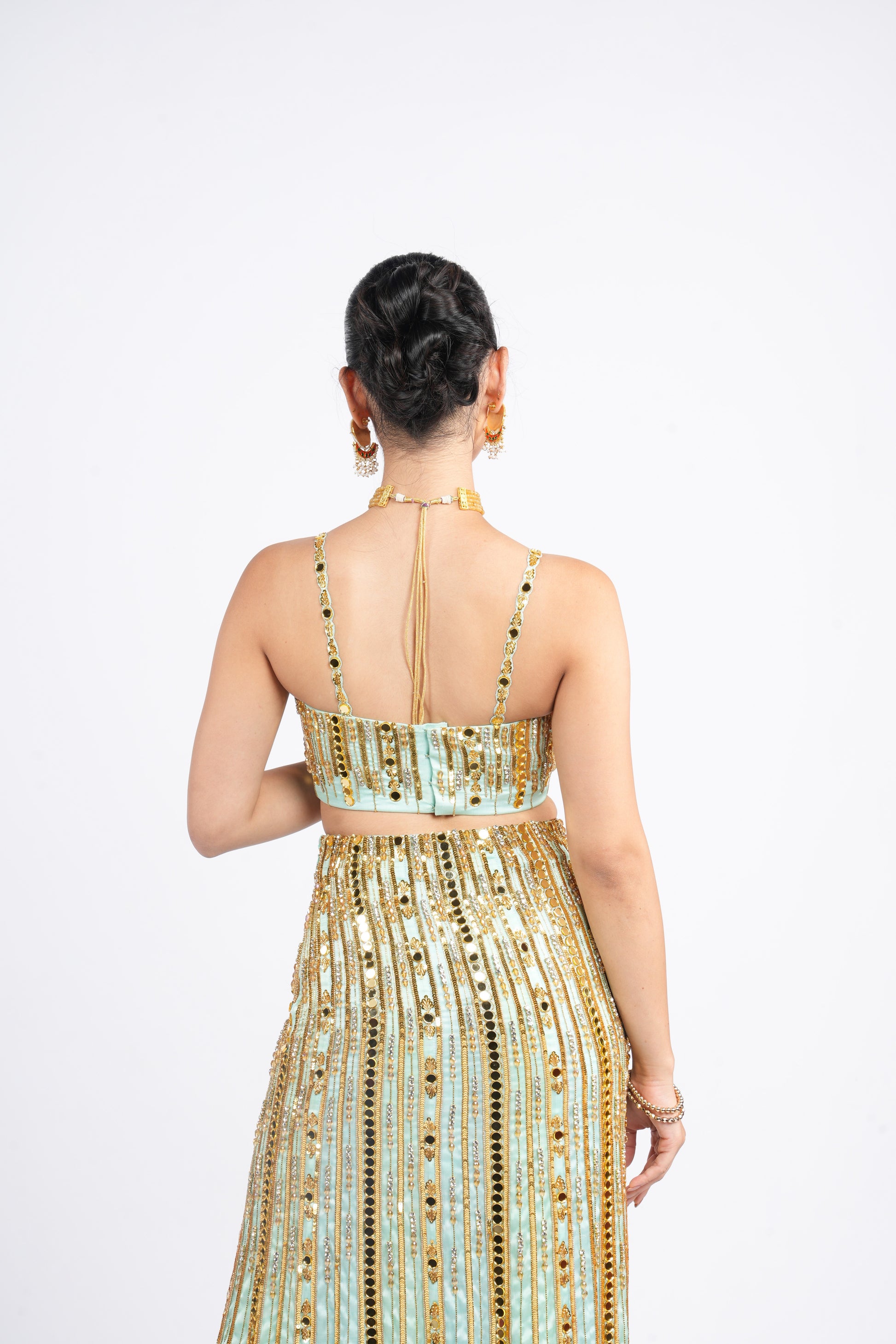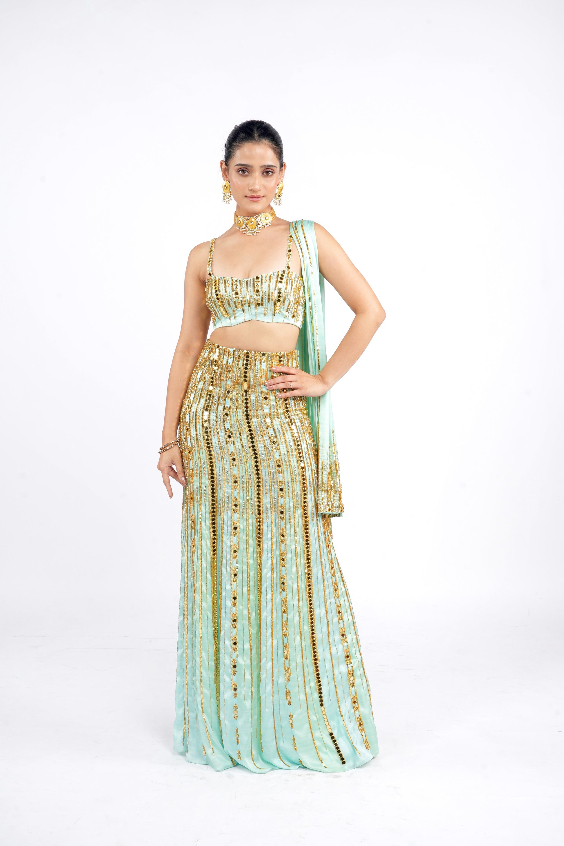 Dazzling beads and acrylic mirrors catch the light like the quiet spark of a woman’s spirit. Jewel straps embody her grace — elegant, yet infinitely powerful. Across sea blue and pista green panels, mirrors, glass stones, and seed beads cascade into a gentle twirl. Paired with an embroidered modern scarf dupatta, it’s a vision of strength wrapped in serenity.