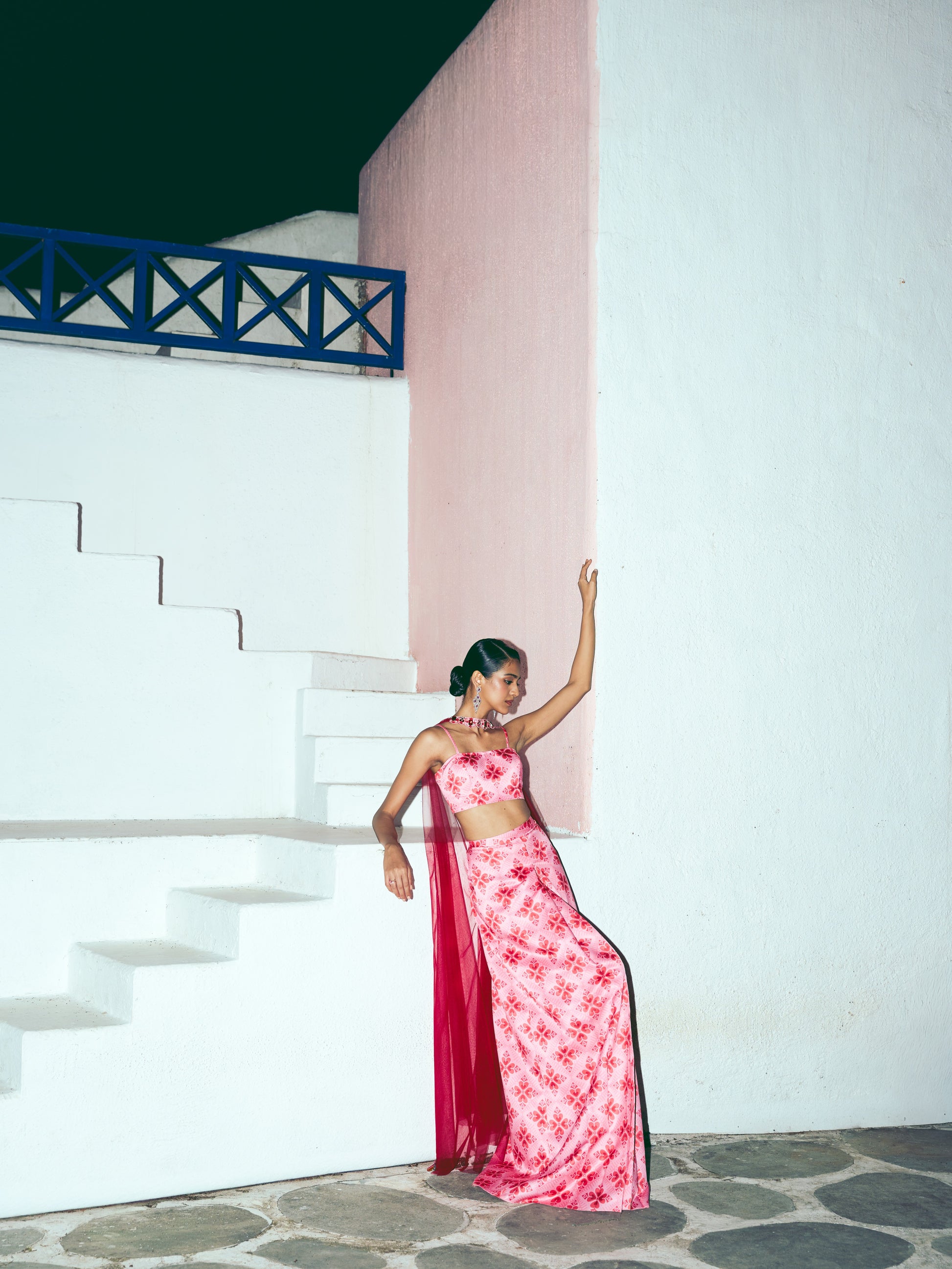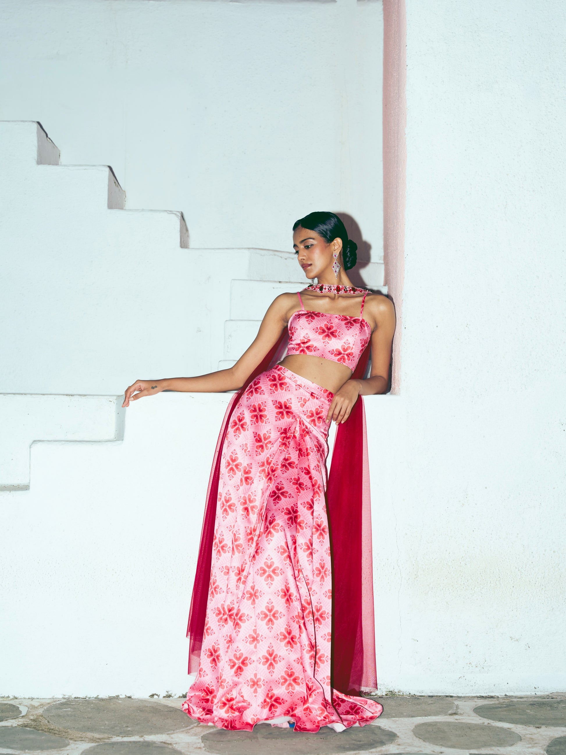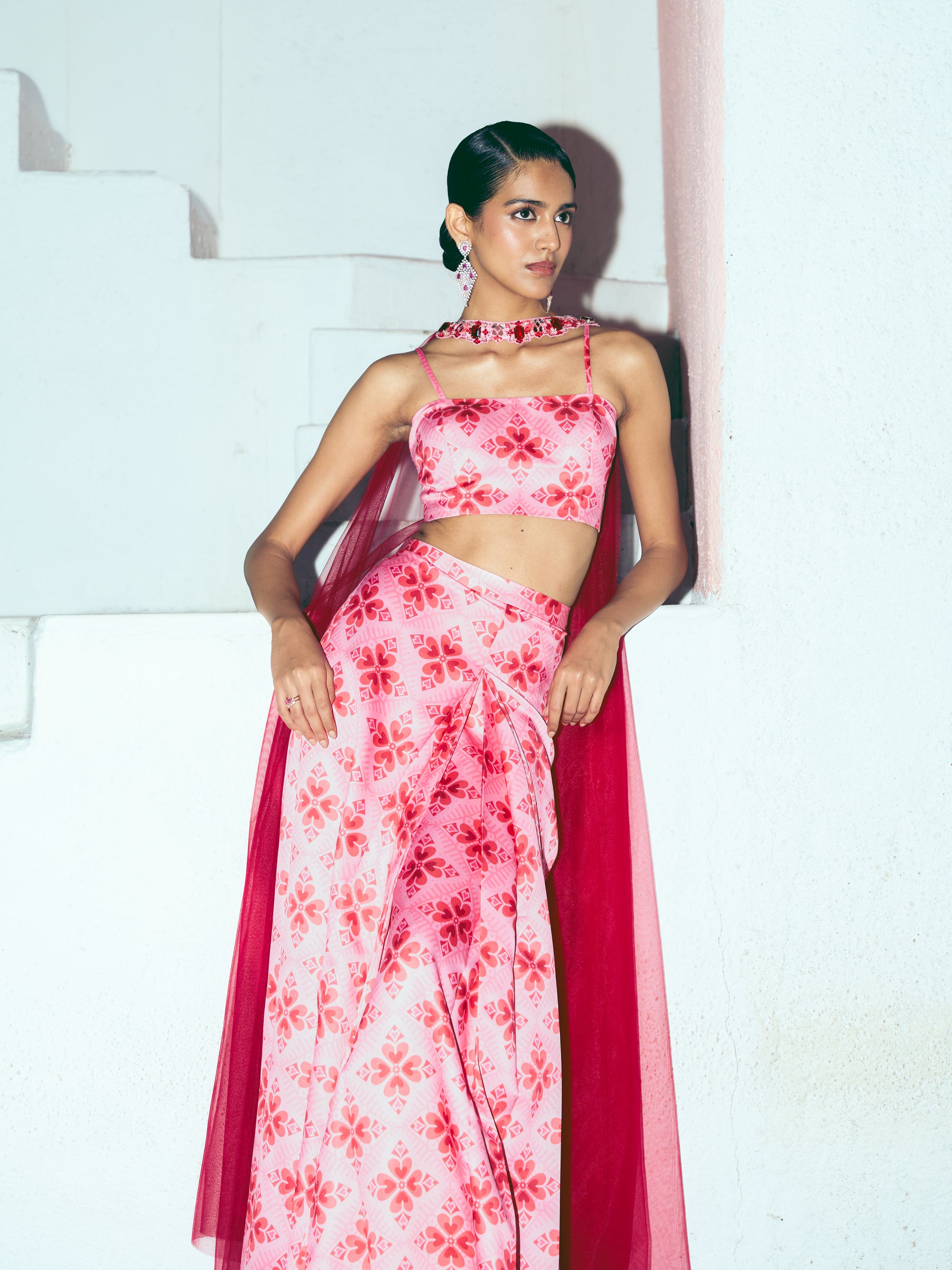 Our sweet signature hearts print over lush satin. A tube paired with our pleated saree skirt topped with a signature chunky embroidered neck dupatta extending into soft floornlength tulle. Versatile, modern, and sassy, this one’s for the effortlessly chic look oozing sass!