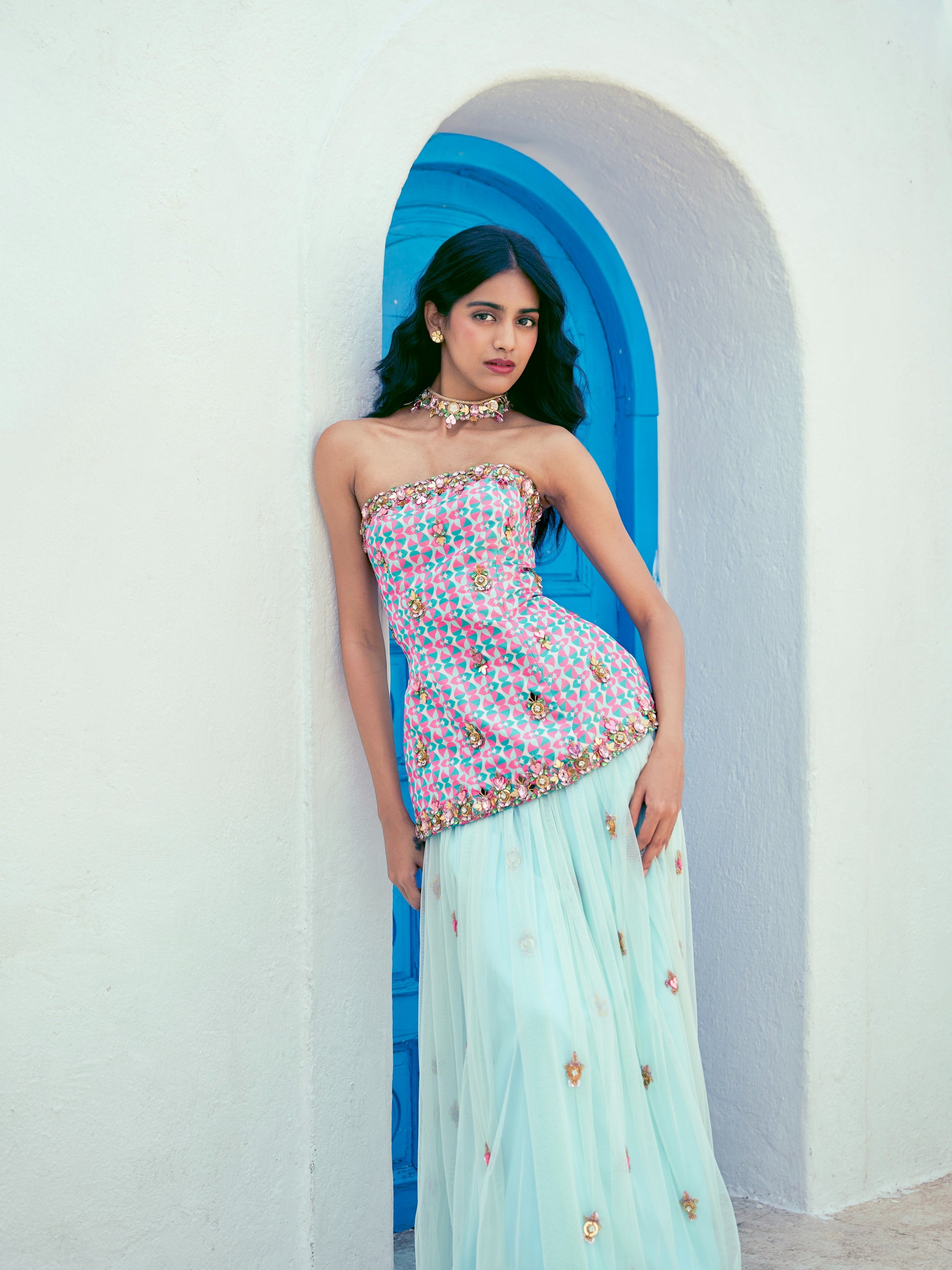 Can’t get — won’t get — enough of this vintage embroidered corset with its charming checks-heart print. The carefully curated embroidery steals the show: luxurious gold details, sparkling stones, and tinted reflective mirrors come together in perfect harmony. A modern silhouette infused with a touch of vintage luxe — timeless, bold, and beautifully crafted.